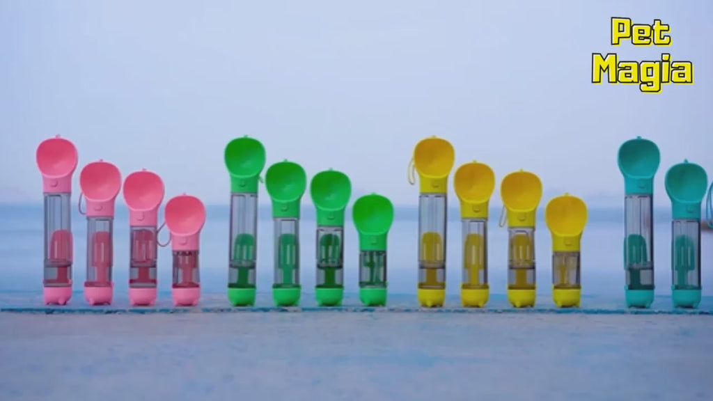A garrafa possui um recipiente para armazenar água e, opcionalmente, um recipiente para armazenar ração. Um botão localizado na parte superior permite o fluxo de água do recipiente da garrafinha para o pequeno bebedouro. Ao soltar o botão o fluxo de água se interrompe.